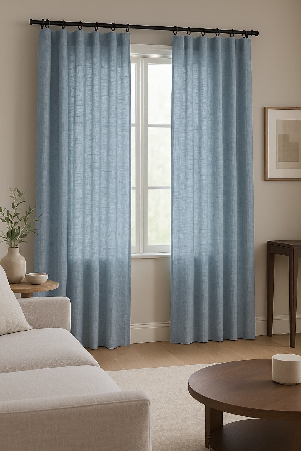 De licht blauwe gordijnen zijn half transparant en filteren het daglicht op een zachte manier, terwijl ze toch voldoende privacy bieden. De stof bestaat uit 54% polyester, 36% viscose en 10% linnen, heeft een soepele valling en een subtiele structuur. Met een hoge slijtvastheid (Martindale 90.000), lichtechtheid 5 en minimale krimp (2%) zijn ze bijzonder geschikt voor dagelijks gebruik.