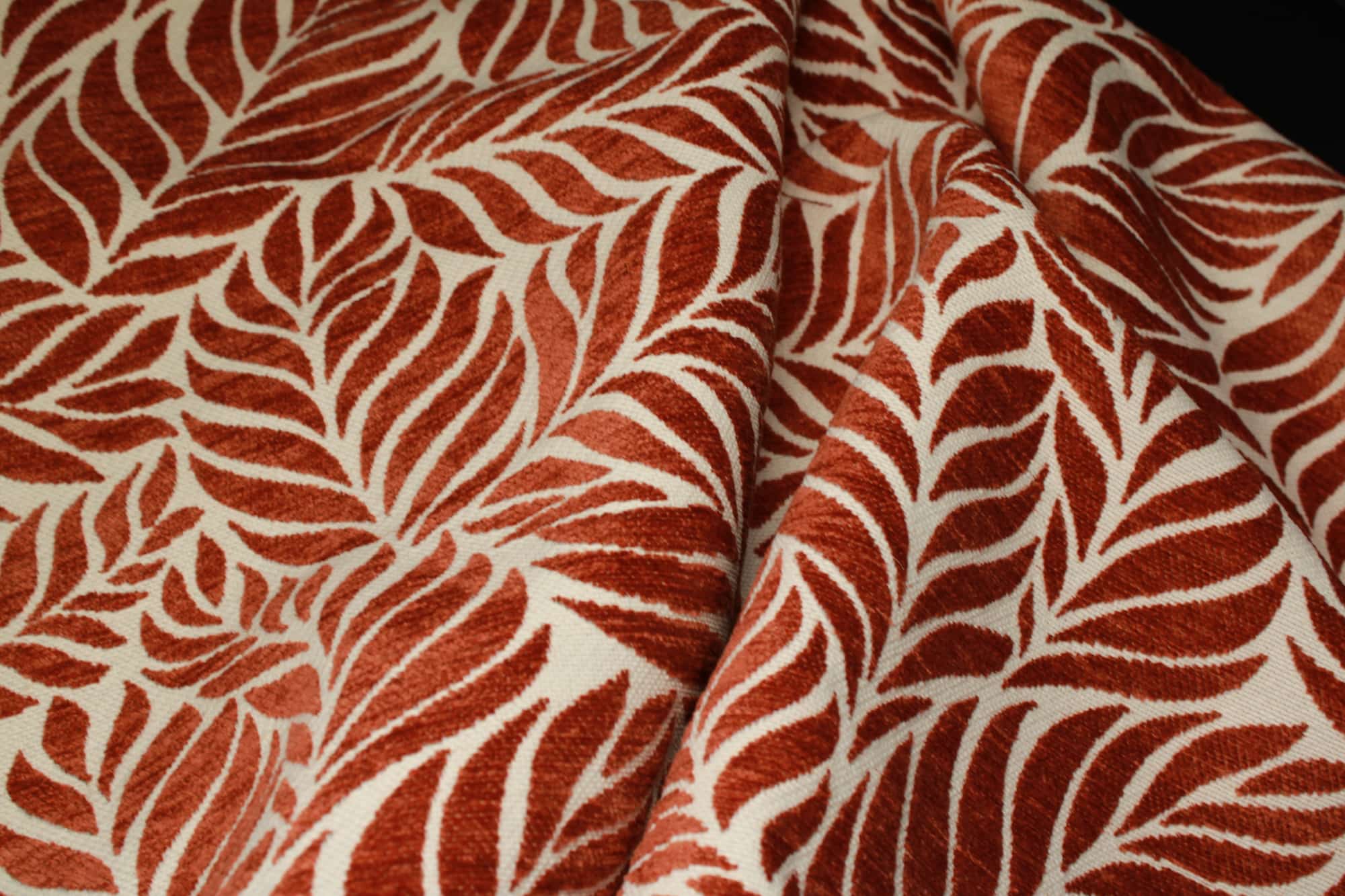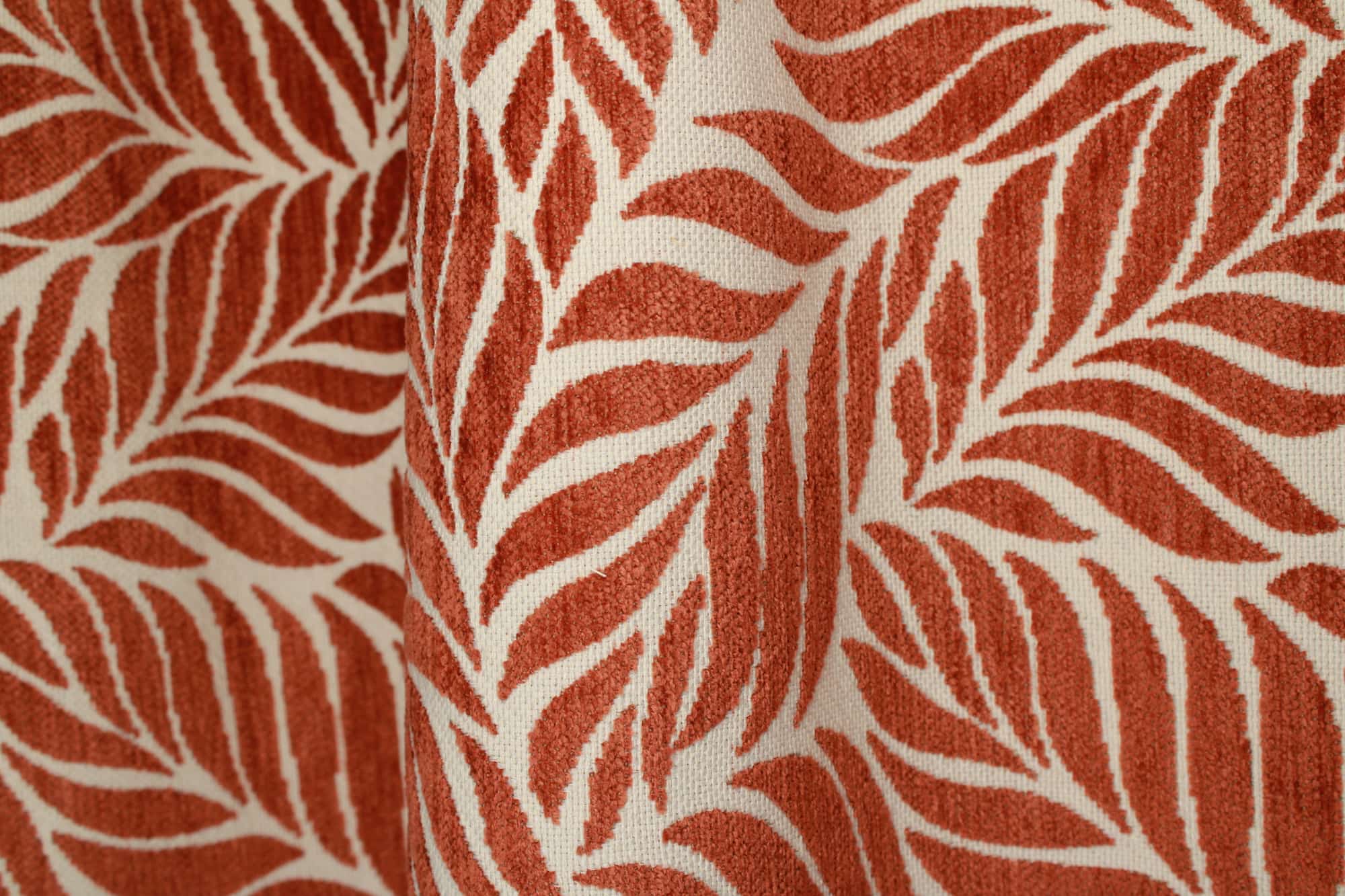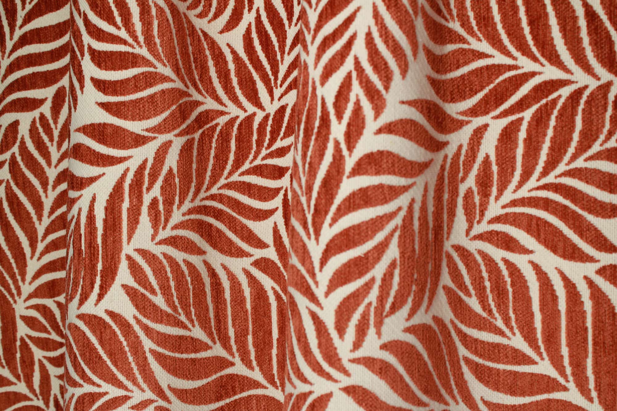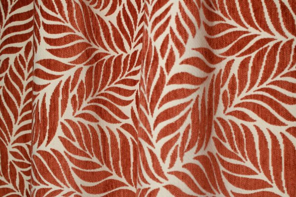 Deze jacquard gordijnen in een terra roodbruine tint zijn gemaakt van een comfortabele chenille stof met een stevige weving. De stof voelt zacht aan en heeft een duidelijke, voelbare structuur. Het ingeweven bladmotief is echt onderdeel van de weving.