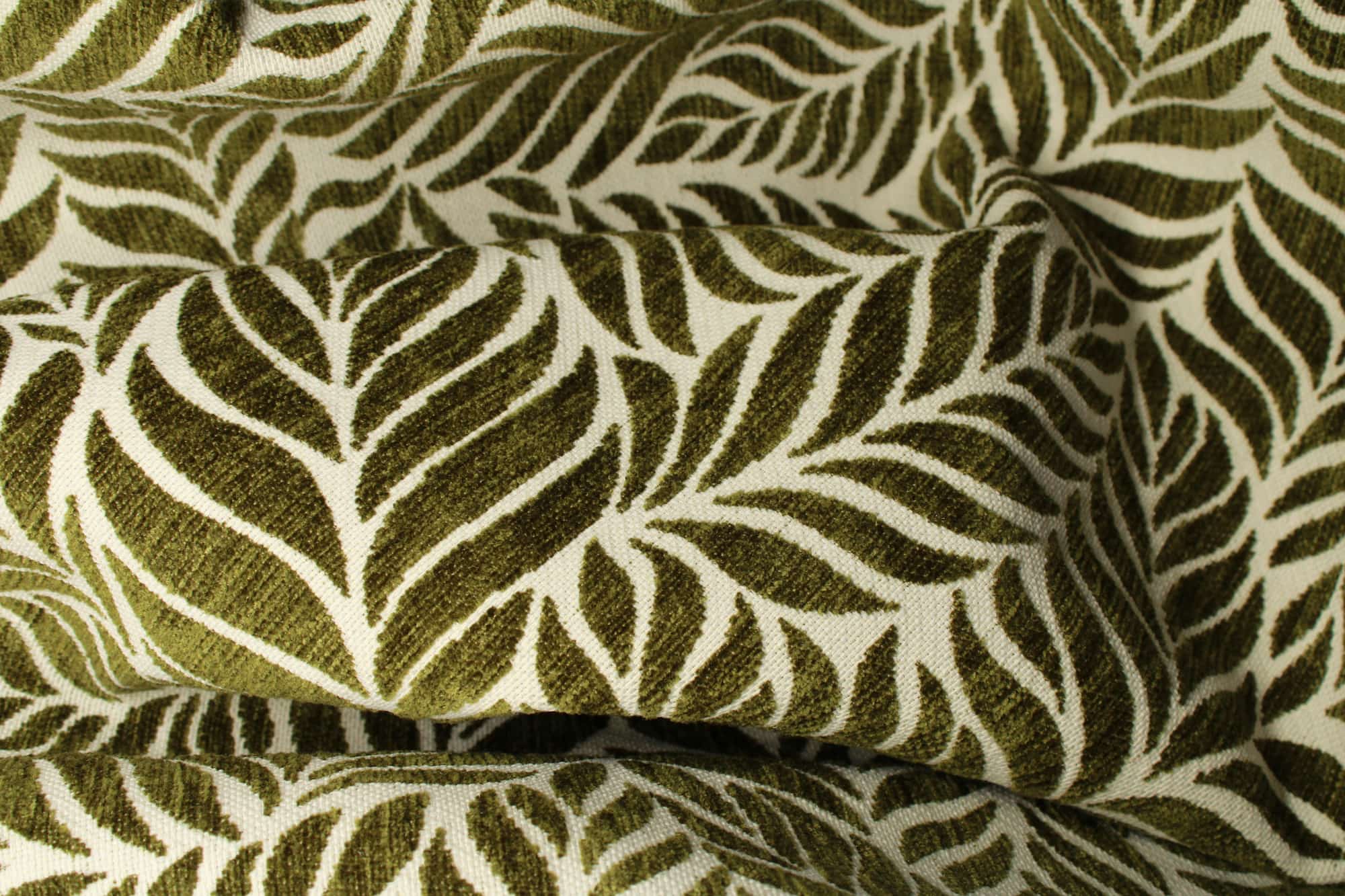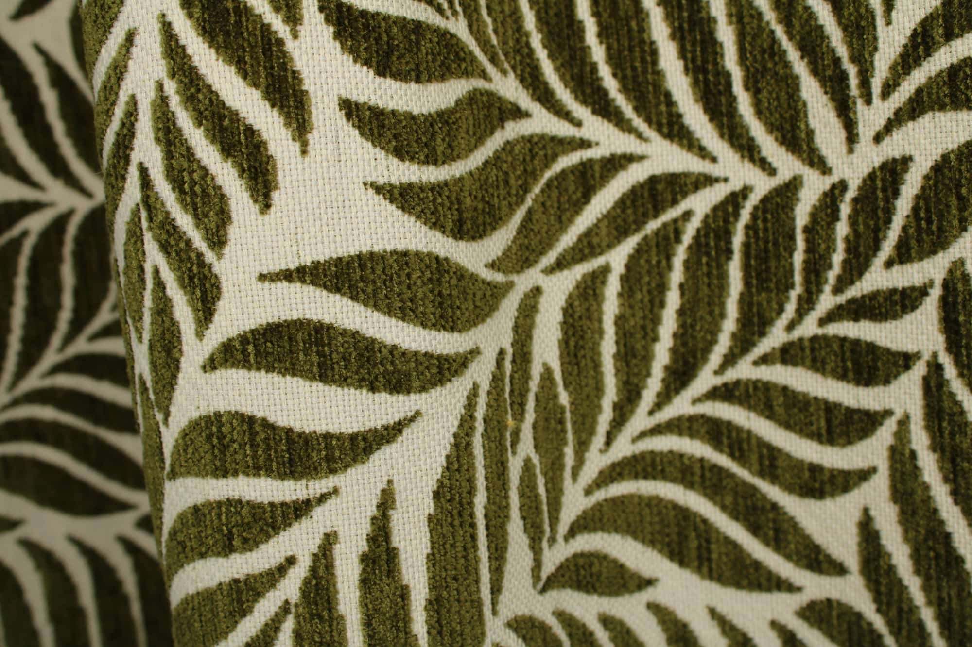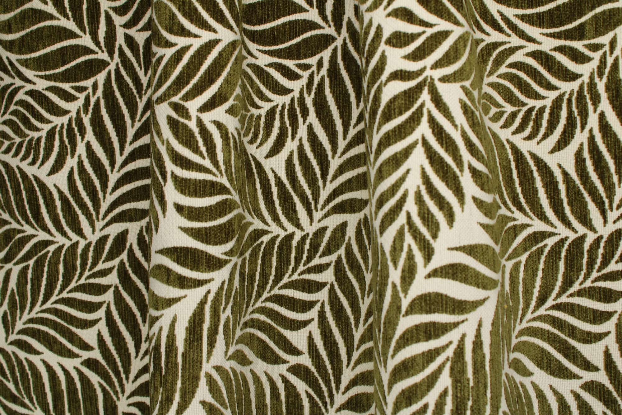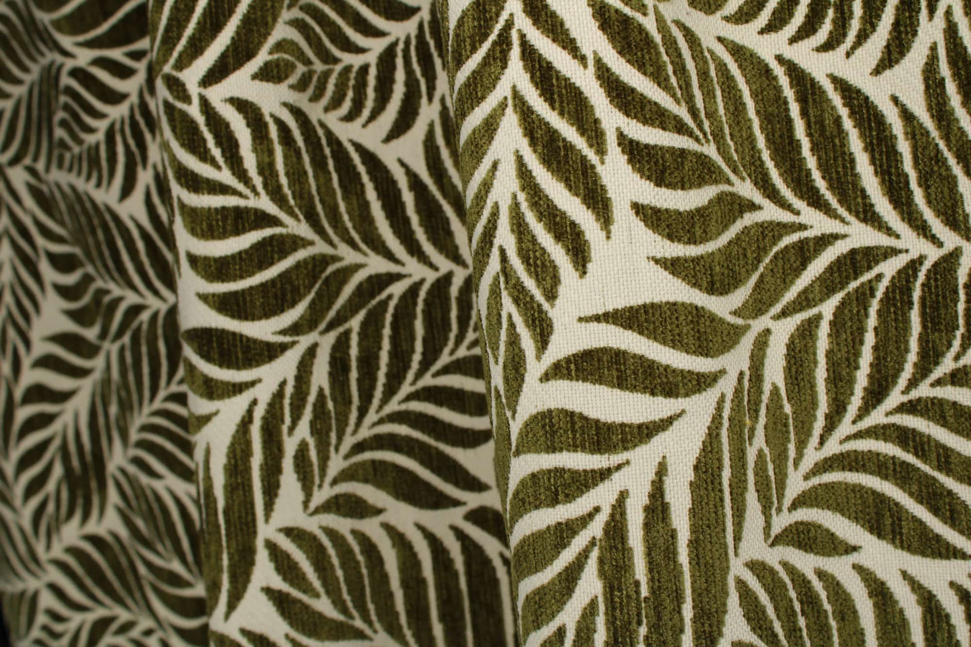 Deze jacquard gordijnen in zacht groen zijn gemaakt van een comfortabele chenille stof met een stevige weving. De stof voelt zacht aan en heeft een duidelijke, voelbare structuur. Het bladmotief is ingeweven in de stof, waardoor het patroon onderdeel is van de weving zelf.