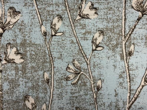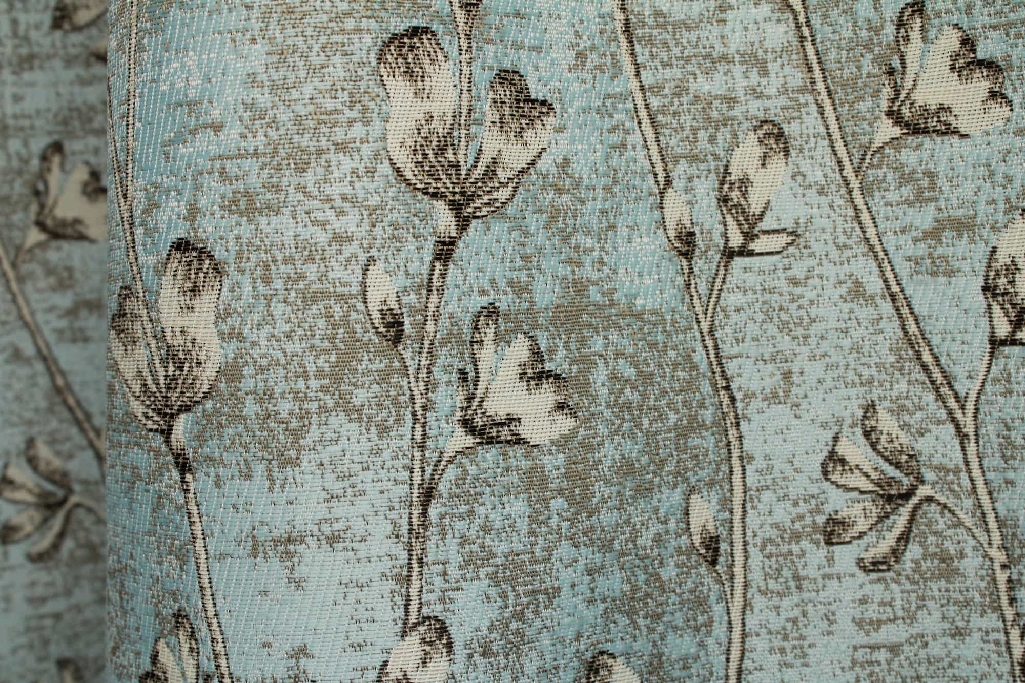 Deze jacquard flora gordijnen in blauw hebben een ingeweven dessin van fijne takken met bloemknoppen die verticaal over de stof lopen. Het patroon is onderdeel van de weving en geen opdruk. De licht gemĂȘleerde achtergrond geeft het geheel wat extra diepte.