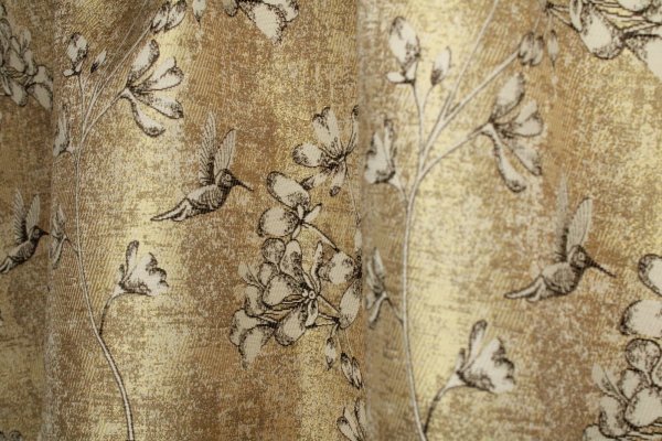 Deze jacquard flora gordijnen in goud hebben een ingeweven patroon van slanke takken met bloemknoppen die rustig omhoog lopen. Het dessin is meegeweven in de stof en geen opdruk. Dat geeft het patroon een natuurlijke diepte. De licht gemĂȘleerde achtergrond zorgt voor een levendig effect zonder dat het druk oogt.