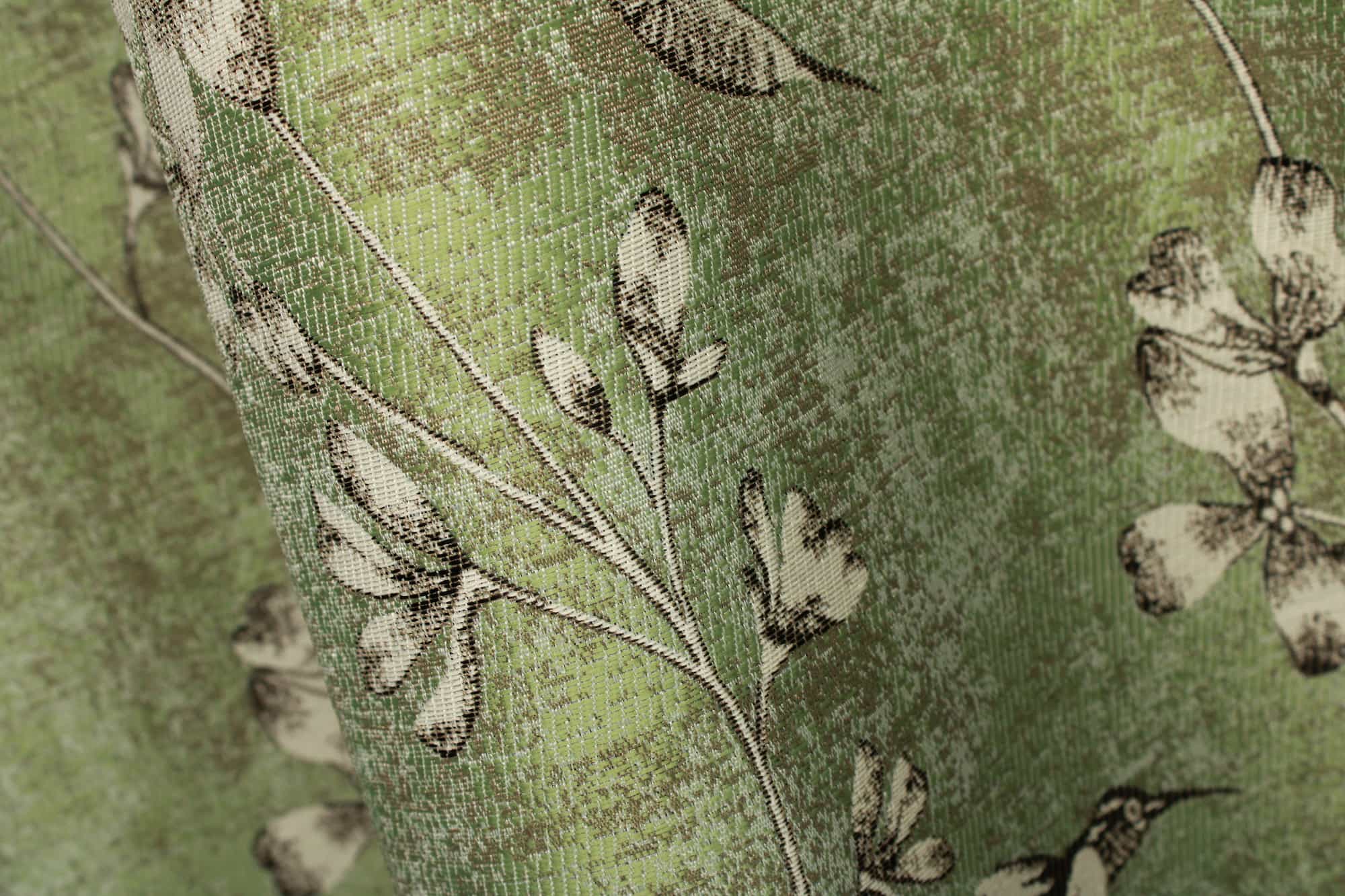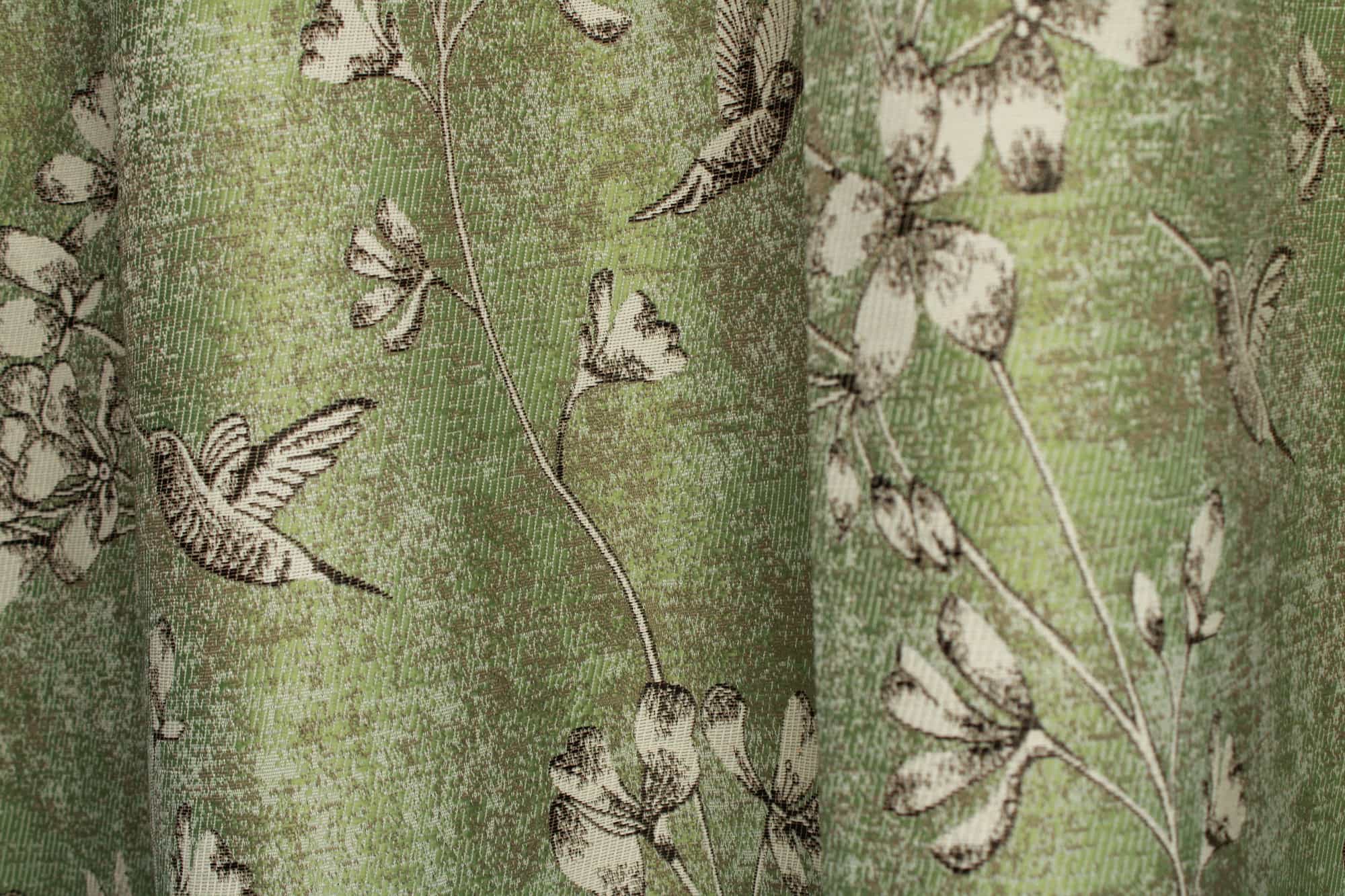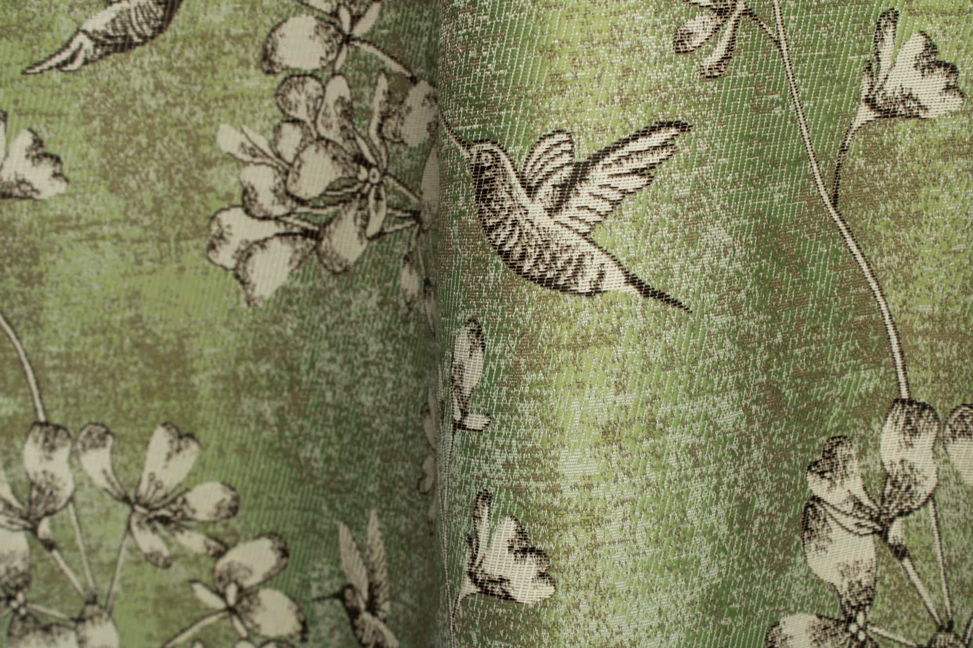 Deze jacquard vogel gordijnen in groen hebben een subtiel ingeweven vogelpatroon dat je vooral ziet wanneer het licht erop valt. Het dessin is onderdeel van de stof zelf en geeft een rustige uitstraling met natuurlijke diepte.