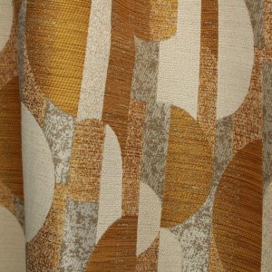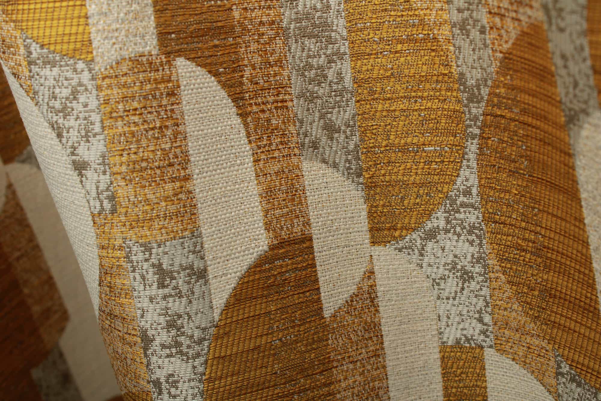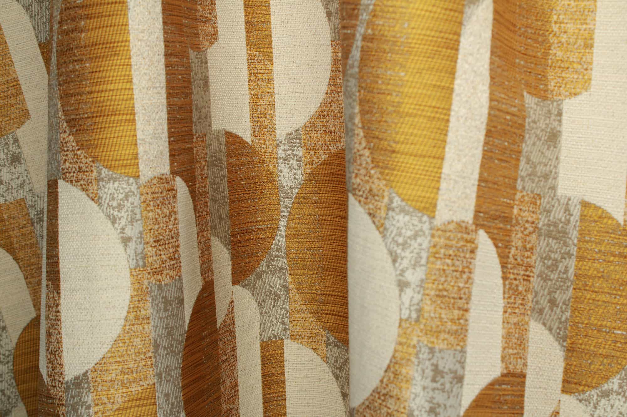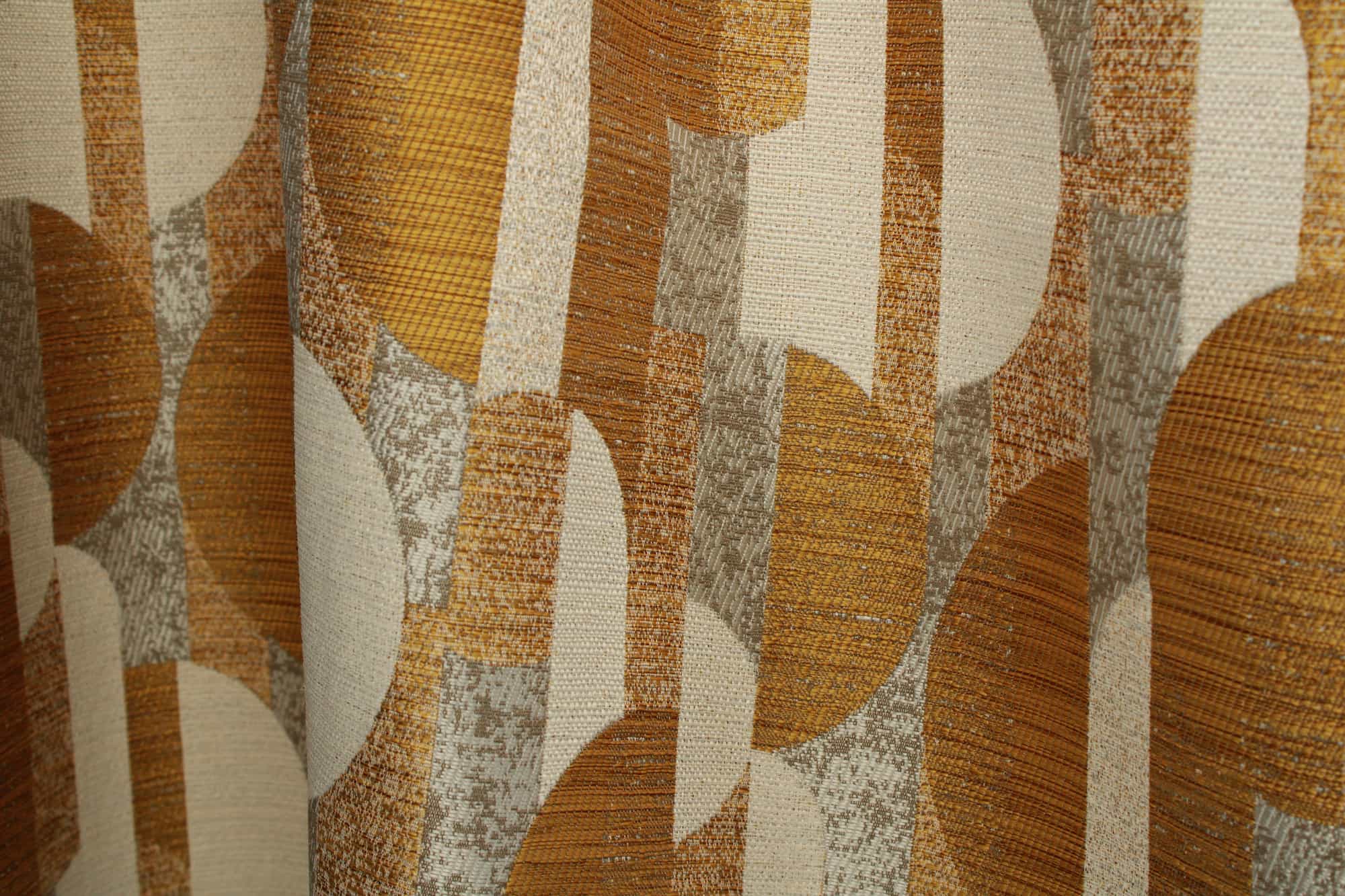 Deze vintage gordijnen in okergeel hebben een ingeweven grafisch patroon dat direct doet denken aan het interieur uit de jaren 70. Het dessin is meegeweven in de jacquard stof en ligt niet bovenop, waardoor het patroon subtiel zichtbaar blijft en mooi in de stof opgaat. Zo krijg je vintage gordijnen met karakter, maar zonder dat het geheel te druk oogt.
