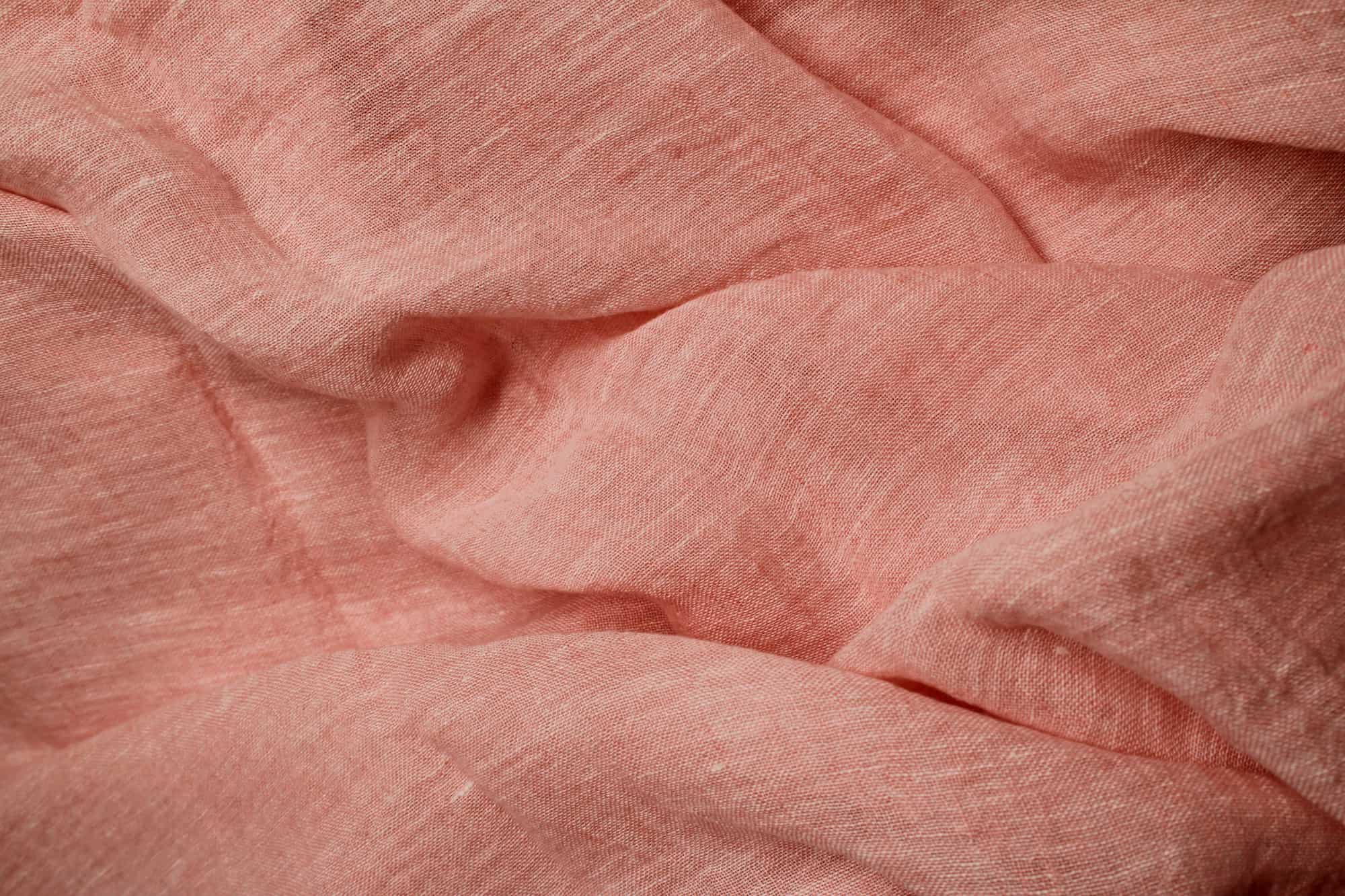 Het open linnen laat het daglicht prettig door en filtert het licht lichtjes. De ruimte blijft helder, met minder inkijk. De roze tint oogt zacht en natuurlijk en verandert subtiel met het licht, zonder te aanwezig te worden.