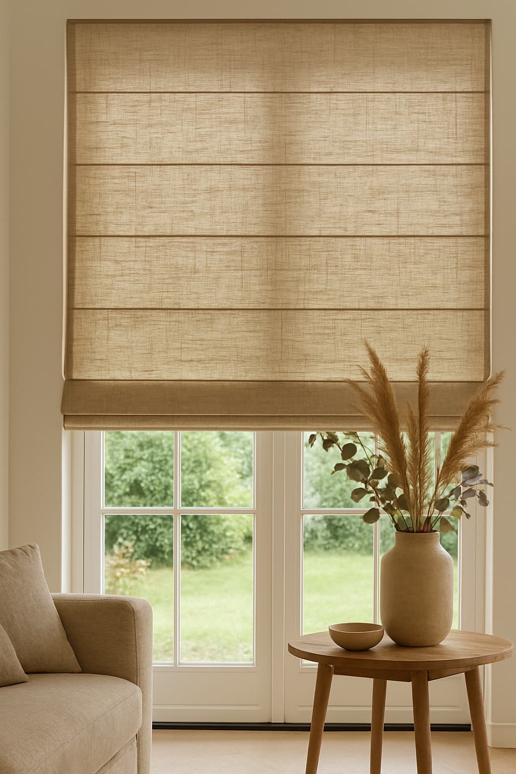 Beige vouwgordijnen zijn tijdloos en veelzijdig. Ze vormen een rustige basis in moderne en Scandinavische interieurs en zorgen voor warmte en gezelligheid in landelijke of klassieke woonstijlen.